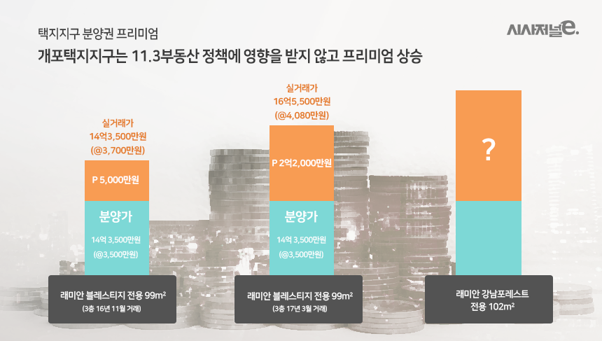 25일 관련업계에 따르면 내달 서울 강남구 개포택지지구에서 래미안 강남 포레스트(개포시영 재건축) 분양을 앞둔 삼성물산이 최근 사전홍보관을 열고 대기수요 잡기에 한창이다. 회사는 홍보과정에서 자사가 지난해 바로 옆 입지에 분양한 단지를 예로 ‘4개월만에 1억7000만원이 올랐다’며 ‘부동산 정책에 영향을 받지 않고 프리미엄이 상승하는 곳’이라고 소개하고 있다.