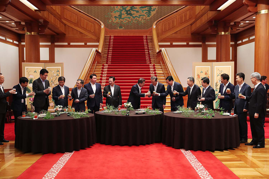 공교롭게도 이날 참석자들은 소속사가 국정농단에 연루돼 재판이 진행 중인 경우가 많았다. 때문에 문 대통령과 기업인 사이에 민감한 발언이 나올지에 관심이 쏠렸다. 그러나 문 대통령은 평창 올림픽, 일자리, 조선업 등 산업 전반에 대한 대화를 이끌었다.