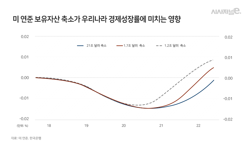 한국은행이 미국 연방준비제도(연준)의 보유자산 축소가 한국 경제에 미치는 영향이 크지 않을 것이라 진단했다. 또 이에 따른 국내 성장률 하락폭은 최대 0.02%포인트에 미치지 못하는 것으로 분석했다.