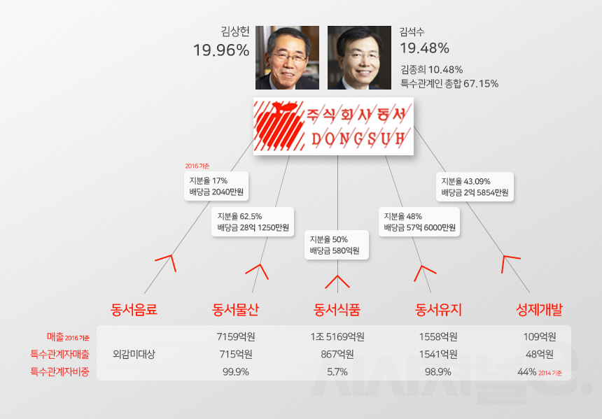 이 때문에 국세청이 지난 2013년 동서그룹에 대한 특별 세무조사에 나서면서 고배당을 실시한 동식식품과 내부거래가 급증한 성제개발에 대한 집중조사를 벌였던 것으로 전해지고 있다. 성제개발의 경우 김종희 전무가 32.98%의 지분을 갖고 있기 때문에 동서그룹의 일감이 몰릴 경우 이곳에서 발생한 수익과 배당으로 향후 동서 지분을 확보하는데 큰 역할을 할 수 있다. 한 회계사는 “성제개발은 향후에도 3세 경영을 위한 그룹 내 자금줄 역할을 할 것으로 보인다”고 밝혔다.