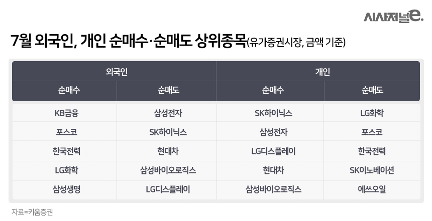 개인 투자자는 반대로 움직였다. 외국인이 두 번째로 많이 팔아치웠던 SK하이닉스를 가장 많이 매수했다. 개인은 지난달 SK하이닉스를 5786억원어치 순매수했다. 또 개인은 외국인 순매도가 가장 컸던 삼성전자도 5733억원어치를 순매수했다.