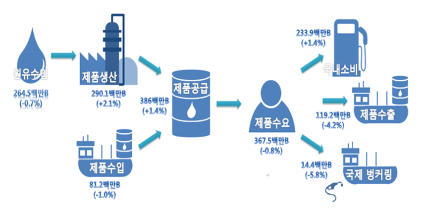 하지만 원유 수입과 석유제품 수출입은 지난해 같은 기간과 비교해 감소했다. 원유 수입량은 지난해 동기 대비 0.7% 감소해 2억6450만배럴을 기록했다. 지역별로는 중동산 원유 수입이 지난해 대비 3.6% 줄었다. 아시아 유럽지역으로부터 수입은 증가하면서 중동에 치중된 원유 수입 다변화가 다소 진전됐다.