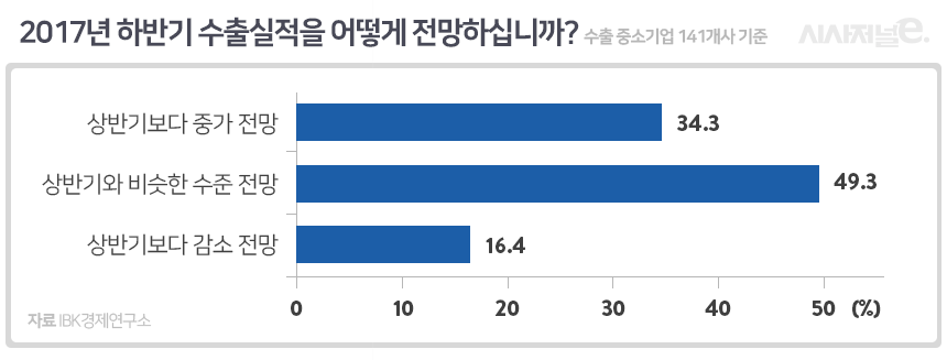 ‘상반기보다 감소할 것’이라는 기업은 16.4%에 그쳤다. 전체 수출 중소기업 141곳 중 약 20여곳 만이 수출이 감소한다고 답한 셈이다.
