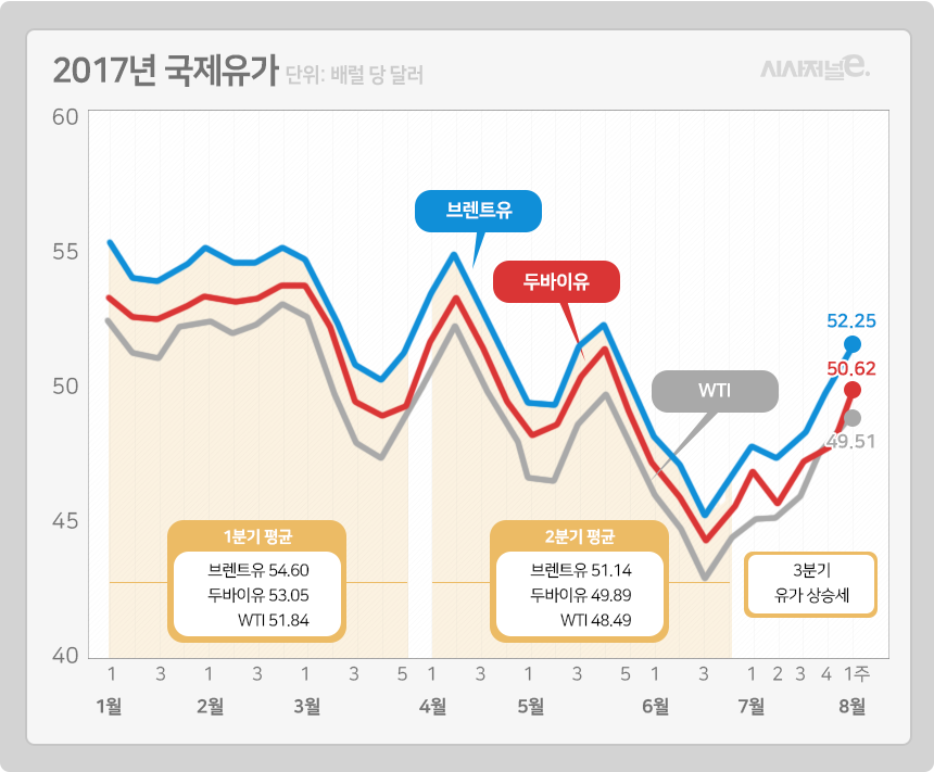3분기 들어 회복세를 기록하고 있는 국제유가는 서부텍사스산원유(WTI) 기준 배럴당 50달러 돌파를 목전에 두고 있는 상황이다. WTI 선물은 지난 4일 기준 배럴당 48.95달러에 거래됐다. 브렌트유와 두바이유는 이미 배럴당 50달러 위에서 거래되고 있다.