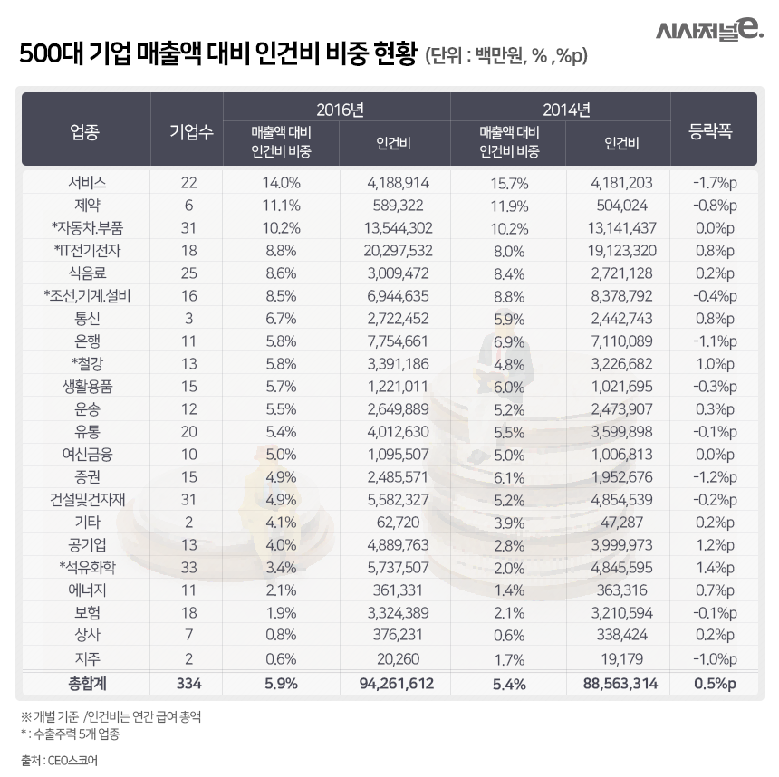지난해 국내 500대 기업 매출액 대비 인건비 비중이 2년새 소폭 상승한 것으로 나타났다.