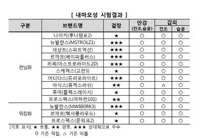 소비자원 10개 스포츠 브랜드 운동화 총 13종 시험조사 결과