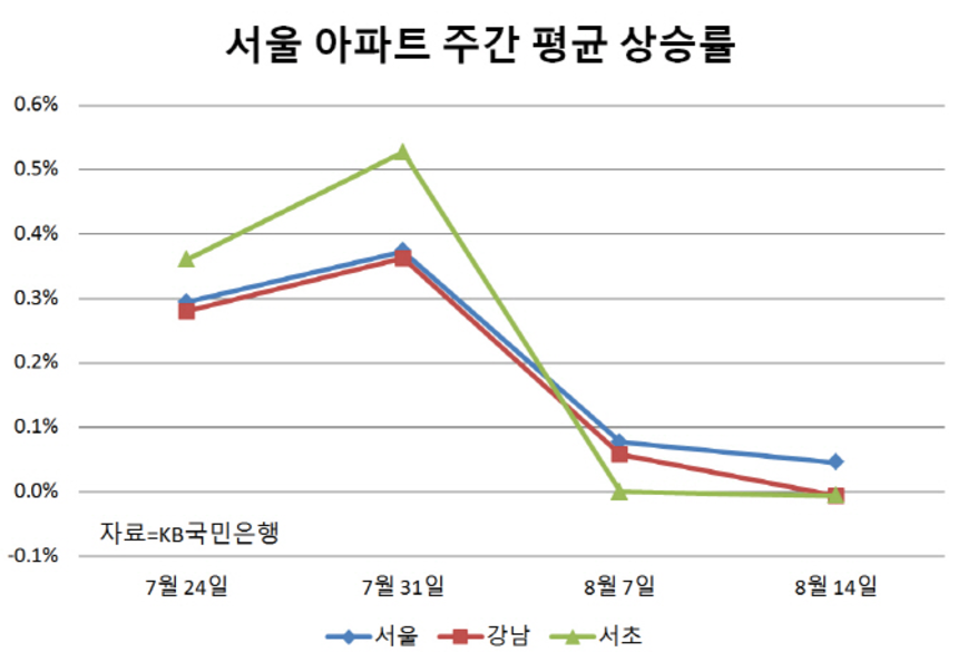 21일 국민은행에 따르면, 이달 14일 기준 서울 아파트 매매가격 평균 주간 상승률은 0.05%로 2주 연속 둔화했다. 서울 아파트값은 8·2 대책이 발표 직전인 7월 31일 조사 기준 전주 대비 0.37% 올랐으나, 대책 발표 직후 이달 7일 0.08%로 상승률이 둔화된 데 이어 또 다시 상승폭이 줄어든 것이다.