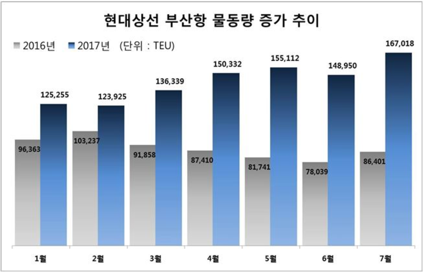현대상선은 최성수기 중국, 동남아 등 시장 선적률이 좋아진 가운데 한진해운 빈자리를 대신하면서 부산항 처리물량이 급증한 것으로 분석하고 있다. 해외 터미널 인수 등을 통한 경쟁력 강화로 외국 화주들의 한국 선사에 대한 신뢰도가 다시 높아진 점도 큰 요인으로 작용했다.