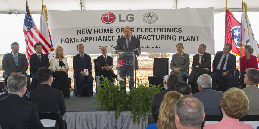 LG전자는 현지시간 24일 신공장이 들어설 테네시주 클락스빌(Clarksville) 예정 부지에서 윌버 로스(Wilbur Ross) 미국 상무장관, 밥 코커(Bob Corker) 테네시주 상원의원, 마샤 블랙번(Marsha Blackburn) 테네시주 하원의원, 밥 롤페(Bob Rolfe) 테네시주 상공부장관, 킴 맥밀란(Kim McMillan) 클락스빌 시장, 안호영 주미 한국대사, 송대현 LG전자 H&A사업본부장(사장), 한주우 글로벌생산부문장(부사장) 등이 참석한 가운데 세탁기 생산공장 착공식을 열었다.