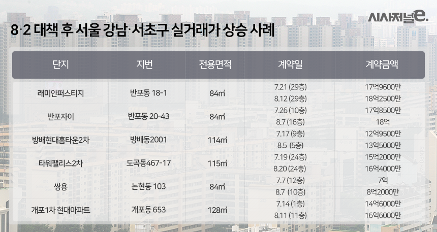 8·2 부동산대책 쇼크로 수도권 주택시장 전체가 얼어붙은 가운데 강남권 일부단지는 대책 발표 직전보다 높은 값에 거래가 이뤄진 것으로 나타나 눈길을 끌고 있다. 집값이 대책발표 직전과 비슷한 수준이거나 오름세를 보인 곳은 입주 10년차 내외 실거주 목적이 뚜렷한 단지라는 공통점이 있다. 반면 규제가 재건축 투자수요 제한에 집중됐던 만큼 이들 재건축 단지는 거래량도 대폭 감소했을 뿐 아니라 억대로 하락해 실거래됐다.