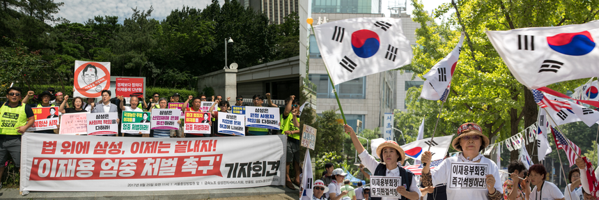 뇌물 공여 혐의 등으로 재판에 넘겨진 이재용 부회장에 대한 1심 선고를 앞둔 지난 25일 서울 서초동 법원 앞은 말 그대로 아수라장을 방불케 했다. 이재용 부회장 유죄 및 무죄를 주장하는 보수, 진보 단체회원들이 모여 목소리를 높였기 때문이다.