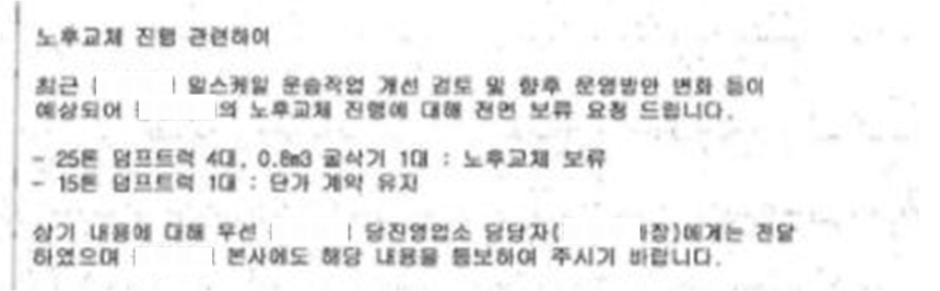 현대제철은 A사가 B사 장비 42대 인수 및 근로자를 승계하고 현대글로비스 장비 36대까지 가져온 2014년 노후장비 교체 투입 의사를 밝혔으나, 2015년 6월 “향후 운영방안 변화가 예상돼 노후 장비 교체를 보류한다”고 전달했다. 현대제철은 애초 노후교체를 예정했던 25톤 덤프트럭 4대, 굴삭기 1대를 보류하고 15톤 덤프트럭에 대해서만 단가 계약을 유지했다.