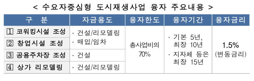 코워킹 커뮤니티시설과 창업시설 조성 융자는 건설‧매입‧리모델링 자금 등을, 공용주차장 조성 융자는 건설 자금을, 상가 리모델링 융자는 리모델링 또는 건설자금이 지원된다.
