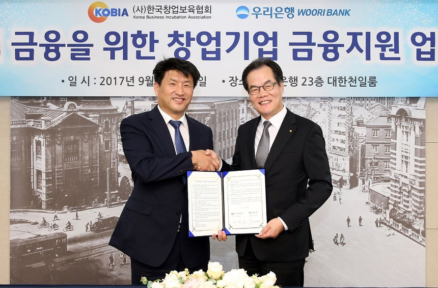9일 업계에 따르면 창업기업에게 도움을 주는 은행권의 움직임이 점점 확발해지고 있다. 우리은행은 8일 중구 본점에서 한국창업보육협회와 ‘생산적 금융을 위한 창업기업 금융지원 업무협약’을 체결했다. 우리은행은 앞으로 한국창업보육협회가 추천한 기업에 보증서대출 지원, 수수료 우대 등을 지원할 예정이다.
