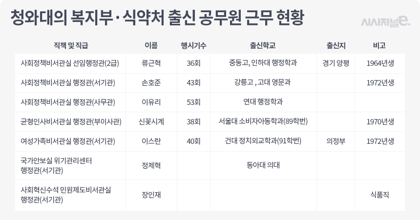 국민들이 청와대에 제기한 민원을 검토하고 분석해 제도개선 등을 추진하는 업무를 담당하고 있다. 카운터파트는 국민권익위원회다. 당초 복지부에 보건직으로 입부한 장인재 행정관은 식품의약품안전본부로 자리를 옮기며 식품직으로 직렬을 변경했다. 현재 식약처 관련 업무는 사회정책비서관실 여준성 행정관이 진행하고 있다.