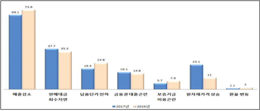 매출감소를 선택한 업종은 서비스업(도소매업 제외)이 78.3%, 수출기업이 71.6% 순으로 높게 나타났다. 중소기업중앙회는 올해 초부터 본격화한 사드(고고도미사일방어체계) 배치에 따른 중국의 경제 보복 영향이 반영된 것이라고 설명했다.