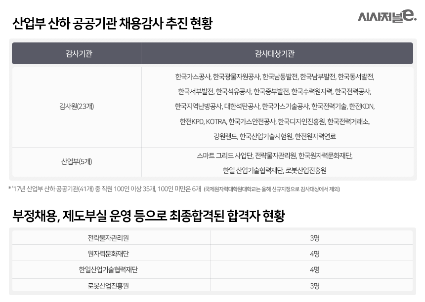 17일 국회 산업통상자원중소벤처기업위원회 소속 이찬열 의원(국민의당)이 산업통상자원부로부터 제출받은 자료 및 감사원 감사 결과에 따르면, 산업 부문 공공기관 가운데 전략물자관리원·한일산업기술협력재단·한국로봇산업진흥원·한국디자인진흥원·대한무역투자진흥공사를 포함해 5개 기관에서 부정채용이 적발됐다.