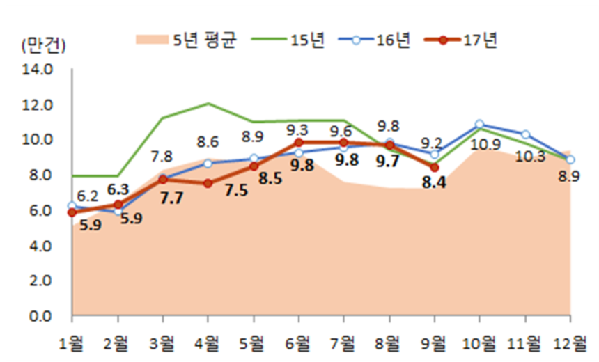 지난 3년과 비교해도 가장 낮은 거래량이다. 전국 주택 거래량은 동월 기준 2014년 8만7000여건, 2015년 8만6000여건, 2016년 9만2000여건을 기록했다. 올해 1월부터 9월까지 누계 주택 거래량은 73만7000여건으로 전년 대비 2.1% 줄었다.