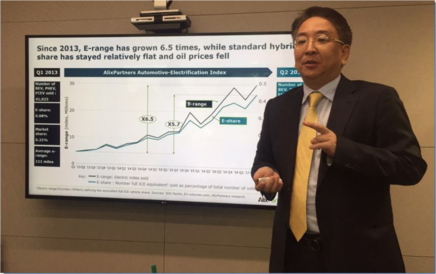 조기연 알릭스파트너스 부사장은 이날 광화문 사무실에서 열린 전기차 동향 관련 간담회에서 “현대·기아차가 지난해 아이오닉 등 전기차 전용 모델을 출시하면서 올해 들어 빠르게 성장하고 있지만, 국산차가 전세계 자동차 시장에서 가진 내연기관 경쟁력에 비해 영향력이 떨어지는 것은 사실”이라며 “전기차 시장 경쟁력 확보를 위해선 모델 확대가 중요하다”고 강조했다.