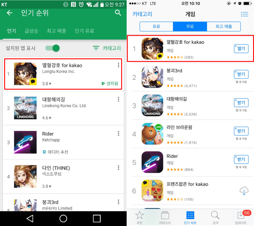 룽투코리아는 중국 조이파이게임(Joypiegame)이 개발하고 자사에서 서비스 중인 모바일 MMORPG 열혈강호 for kakao가 구글 플레이 인기 1위, 애플 앱스토어 인기 1위를 달성하며 양대 마켓을 석권했다고 26일 밝혔다.