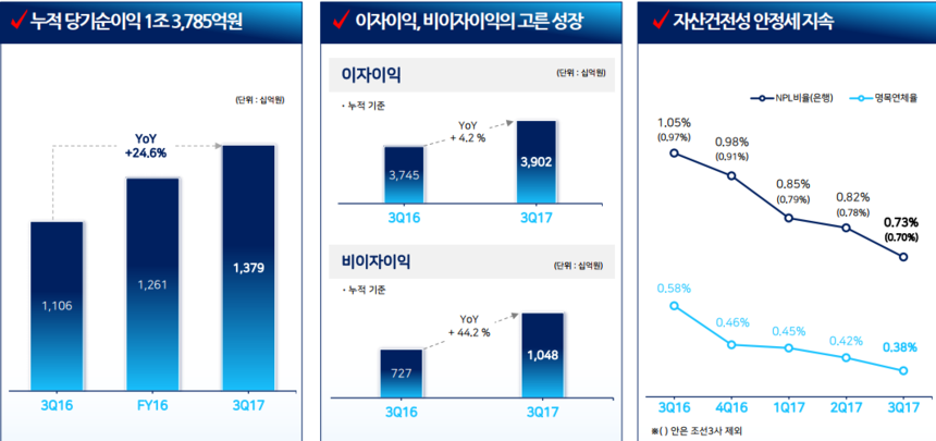 이자이익은 3분기에만 3.1%에 달하는 성장을 보인 저비용예금 증가와 기업 및 가계의 균형있는 대출성장에 힘입어 증가추세를 유지했다. 비이자이익은 수익증권 연간 신규판매액 8조원을 돌파하고, ELT 판매잔고가 전년말 대비 2조7000억원 증가했다.