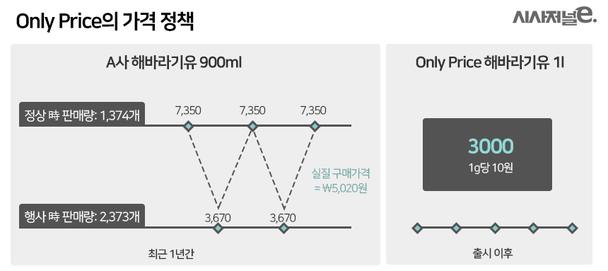 PB상품의 성공 여부를 좌우하는‘가성비’에서 가격부분의 메리트를 과감히 포기하고 공급기간 내내 변하지 않는 가격으로 소비자들의 마음을 사로잡겠다는 의도다. 온리(Only) 프라이스라는 이름도 균일한 가격을 적용하겠다는 의미에서 차용한 것이다.