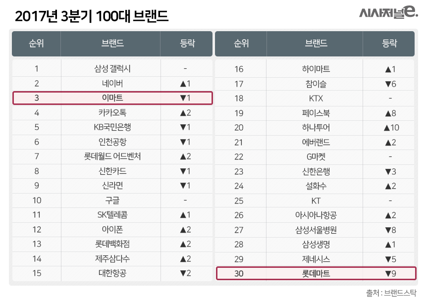 같은 제품군에서 노브랜드와 온리프라이스의 가격이 비슷한 수준일 경우, 소비자들은 제품의 신뢰를 반영하는 브랜드가치에 따라 움직일 가능성이 높다는 것이다. 브랜드스탁이 최근 발표한 올해 3분기 국내 브랜드가치를 보면 이마트는 3위, 롯데마트는 30위다. 유통업체의 브랜드로만 보면 선택의 기로에서 노브랜드로 기울 확률이 크다는 의미다.