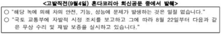다만 혼다코리아가 회신공문에 담은 자발적 시정 조치 보고와 무상 수리 및 재발 보증에 대한 국토교통부 질의 결과, 국토교통부는 자발적 시정 조치에 대한 보고를 받은 적이 없다고 전했다. 국토교통부 관계자는 “시정 조치에 대한 내용을 보고받은 적이 없다”면서 “녹 부식은 주행 안전, 차량 기능과 관계없다는 혼다코리아 설명 역시 사실이 아니다”라고 밝혔다.