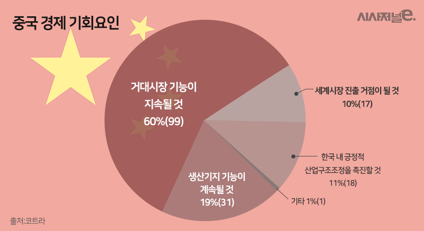 또한 보호무역 기조로 선회한 미국과 달리 중국은 여전히 글로벌 기업에게 매력적인 시장이라는 점이다. 코트라(KOTRA)가 한중 사드 갈등이 한창인 지난 7월 발간한 ‘2017 중국진출 한국기업 경영실태 조사’에 따르면, 중국 현지 법인 253개 업체를 대상으로 중국경제의 ‘긍정적인 요인’을 묻는 질문에 답변자의 60%는 ‘거대시장의 지속’을 가장 큰 기회요인으로 꼽았다. 생산기지 기능 지속(19%)과 세계 시장 진출 기점(10%) 등이 뒤를 이었다. 당시 코트라는 “중국시장에 대한 기대치가 여전히 높다”고 분석했다.