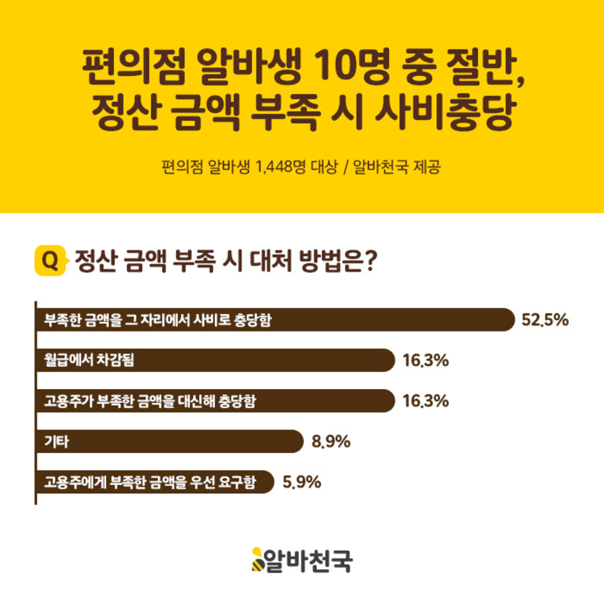 편의점 정산금액이 부족할 때 아르바이트생 사비로 충당하거나 월급에 차감되는 경우가 많은 것으로 조사됐다. 이런 행위가 불법이지만 이를 인지하고 있는 아르바이트생은 10명 중에 3명에 정도에 그쳤다.