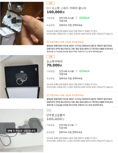 13일 온라인 중고 거래 사이트에는 ‘동전 크기 카메라’, ‘초소형 라이터 카메라’, ‘초소형 무선 카메라’ 등 몰래카메라로 악용될 가능성이 높은 초소형 카메라를 판매한다는 글이 게재돼있다. 이들 제품은 ‘기타 카메라 악세서리’, ‘디지털 캠코더’, ‘기타 영상관련제품’, ‘기타 중고’ 등 다양한 카테고리에서 판매되고 있었다. 게재된 게시글에는 “렌즈가 작아 사용하기 편리하다”, “적외선 촬영이 가능해 어두운 데서도 잘 찍힌다”는 등의 상세한 설명도 달렸다.