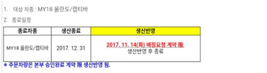 14일 시사저널e가 입수한 ‘올란도/캡티바 신규 생산 계약 종료 안내‘에 따르면 한국GM은 다목적차량(MPV)과 중형 스포츠유틸리티차량(SUV) 캡티바 신규 생산을 올 연말까지만 진행키로 정했다. 이에 14일을 끝으로 15일부터 올란도와 캡티바 신규 계약이 중단된다.