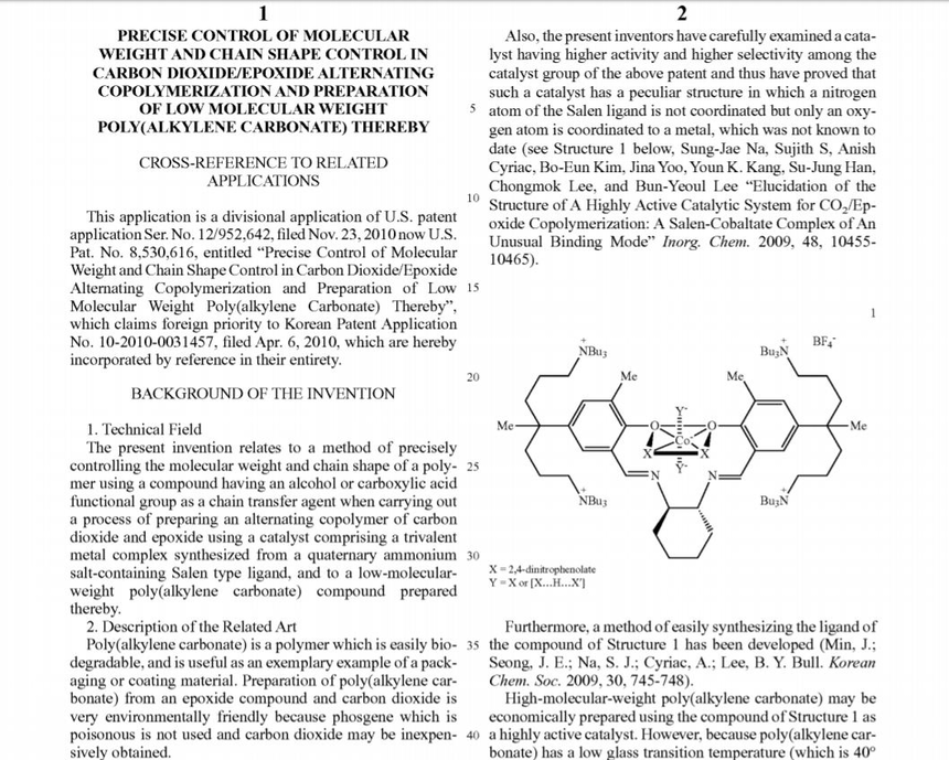 SK이노베이션은 2008년부터 이산화탄소를 플라스틱 원료인 폴리머로 만드는 기술 개발에 나서 성공했다. 해당 특허는 이 과정에서 획득한 것으로 추정되고 있다. 이 시기에 SK이노베이션은 이산화탄소를 플라스틱으로 바꾸는 혁신적인 기술 그린폴에 공격적인 투자를 진행했다. 지구온난화의 주범인 이산화탄소를 사용한다는 점에서 환경이나 기술 측면에서 주목받는 기술이다.
