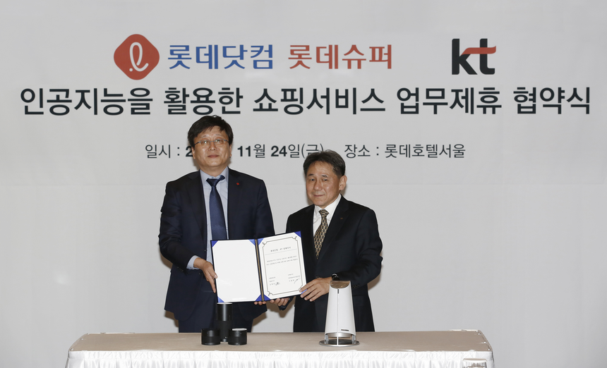 KT는 롯데닷컴과 지난 24일 서울 소공동 롯데호텔에서 인공지능 쇼핑서비스 제공을 위한 업무협약(MOU)을 체결했다고 27일 밝혔다. 양사는 일상생활 속에서 TV 화면을 보면서 음성을 통해 상품을 검색, 주문하고 화자인증을 통한 음성 결제까지 한 번에 이뤄지도록 가구 기반 인공지능 쇼핑 서비스를 구현하기로 했다.