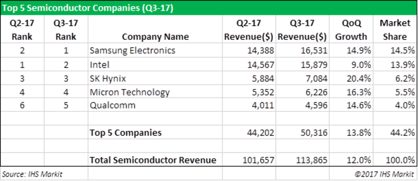 삼성전자와 인텔의 뒤를 이어 SK하이닉스(6.2%), 마이크론(5.5%)가 3, 4위를 차지했다. 퀄컴(4.0%)은 브로드컴을 제치고 5위권에 새로 진입했다. 상위 5개사의 점유율 합계는 44.2%로 집계됐다. 이는 지난해 같은 기간에 비해 4.2%가 증가한 수치라고 IHS마킷은 설명했다.