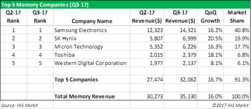 삼성전자는 이 시장에서 3분기 40.8%의 점유율로 압도적 1위를 수성했다. 2위 SK하이닉스도 지난 분기보다 20.5%의 성장세를 나타내면서 점유율을 19.9%까지 끌어올렸다. 3위 마이크론과 4위 도시바의 점유율은 각각 17.7%, 6.8%로 집계됐다. 도시바 메모리 인수전에서 수차례 어깃장을 놓은 웨스턴디지털의 점유율은 6.1%였다.