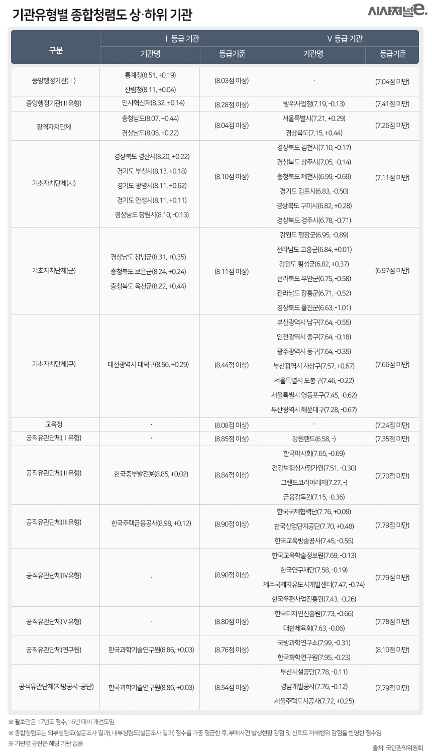 종합청렴도는 외부청렴도, 내부청렴도, 정책고객평가 점수를 가중 평균한 뒤 ,부패사건 발생현황 및 신뢰도 저해행위 감점을 반영해 산출했다. 권익위는 청렴도에 따라 기관들을 최고 1등급에서 최저 5등급으로 나눴다.