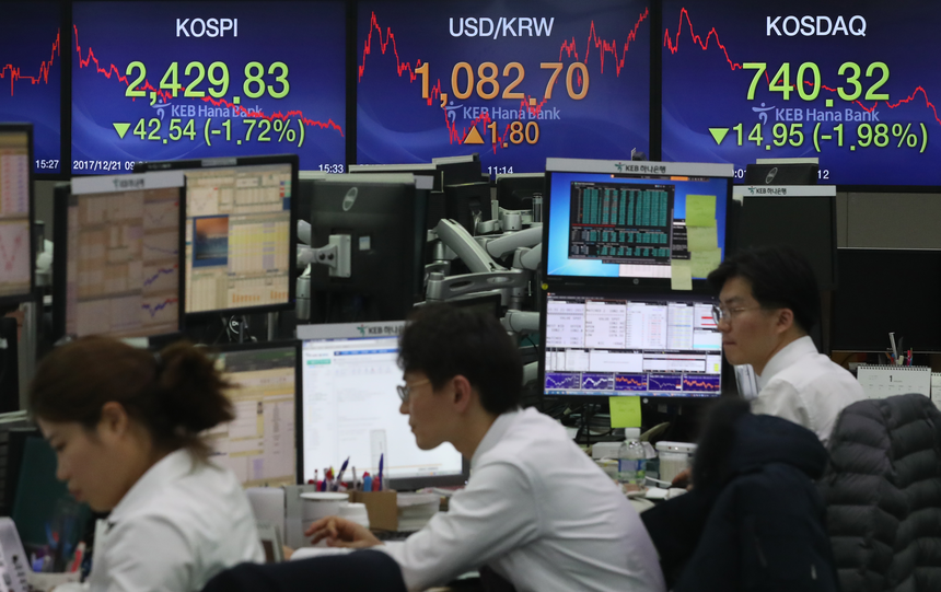 코스피가 2430선을 내줬다. 21일 지수는 전날 대비 42.54포인트(1.72%) 급락한 2429.83으로 거래를 마쳤다. 이로써 코스피는 나흘 연속 하락했다. 지수는 이날 전날보다 1.03포인트(0.04%) 내린 2471.34로 개장해 지속적으로 우하향 흐름을 보였다.