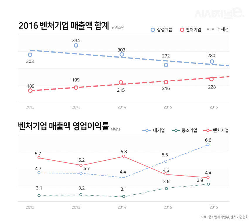조사에 따르면 2016년 벤처기업 매출액 합계는 228조2000억원으로 집계됐다. 기업당 매출액은 68억5000만원으로 전년도 63억5000만원보다 7.9% 증가했다. 2014년 이후 3년째 마이너스 성장을 기록한 대기업보다 높은 증가율을 보였다. 대기업은 지난해 매출액 1.6% 적자를 기록했다.