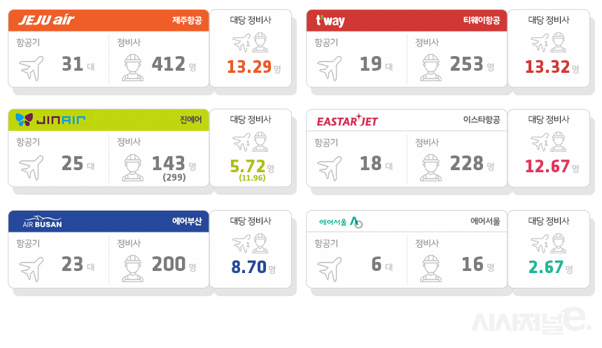 LCC별로 항공사 1대당 정비사 수는 티웨이항공이 13.31명으로 가장 많았다. 다음으로 제주항공과 이스타항공이 13.29명, 12.66명으로 각각 뒤를 이었다. 에어부산은 8.70명에 불과했다. 에어서울은 항공기 총 6대, 정비사 16명으로 항공기 1대당 정비사 수가 2.67명으로 가장 적었지만, 항공기 정비 업무 전체를 모회사인 아시아나항공에 위탁하고 있는 것으로 확인됐다.