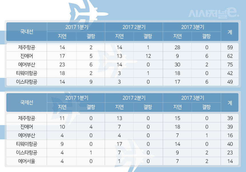 항공기 1대당 정비사 8.7명을 갖춘 에어부산은 올 들어 3분기까지 국내선과 국제선에서 정비 소홀로 인한 운항 지연 및 결항 91건을 기록했다. 티웨이항공과 이스타항공은 각각 82건, 72건을 기록했다.