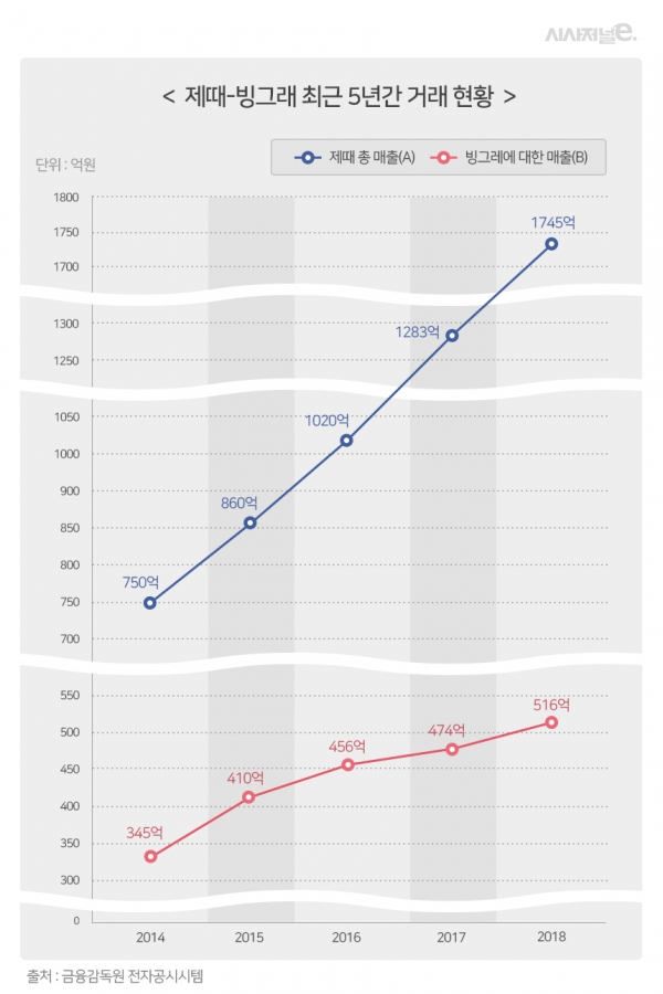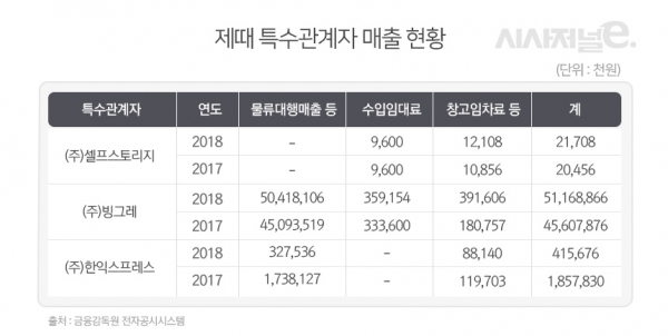 제때의 매출은 주로 빙그레의 냉장·냉동 제품을 운송하며 발생한다. 제때는 1998년 빙그레에서 분리해 나왔고 2016년에 KN물류에서 사명을 현재 이름으로 변경했다. 제때의 매출이 2014년 750억원에서 지난해 1745억원으로 증가할 때, 이 기간 빙그레의 일감도 345억원에서 516억원으로 늘었다. 제때와 빙그레의 내부거래 비중은 40% 후반에서 30%대로 낮아지는 추세다.