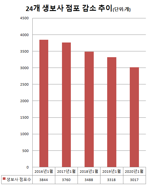 6일 생명보험업계에 따르면 국내 24개 생명보험사의 점포는 올해 1월말 기준으로 총 3017개를 기록했다. 전년 같은 기간(3318개)보다 9.1% 감소했다. 생보사 점포는 매년 빠르게 줄고 있다. 작년 1월 생보사 점포는 전년 대비 4.8% 감소해 감소율은 올해의 절반 수준에 불과했다. 생보업계 점포는 2016년 1월 3844개에서 2017년 1월 3760개, 2018년 1월 3488개, 2019년 1월 3318개를 기록하는 등 매년 감소 규모가 커졌다.
