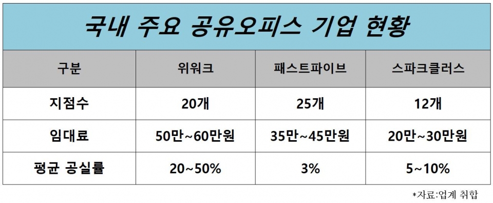국내 공유오피스 시장에서 강자로 군림하던 위워크의 위기는 국내 공유오피스 기업들에 기회가 될 전망이다. 국내 기업들은 저렴한 임대료로 공유오피스 시장에서 가파른 성장세를 나타내고 있다. 패스트파이브는 월 임대료가 1인 당 35만~45만원, 스파크플러스는 20만~30만원 수준이다. 반면 위워크는 50만~60만원으로 가장 높다. 임대료가 낮은 토종 기업에 수요가 몰리면서 공실률도 큰 차이를 나타내고 있다. 위워크의 공실률은 20~50%인 반면 패스트파이브는 공실률 3%를 기록 중이다. 스파크플러스도 5~10% 수준에 그치는 것으로 알려졌다.