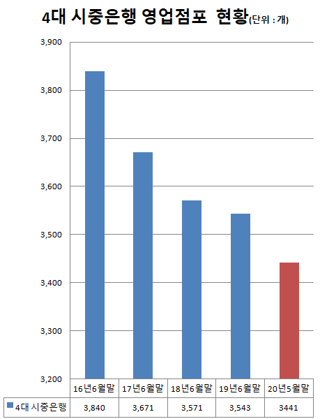 4대 시중은행 점포는 2016년 이후 2년 간 빠르게 진행됐다. 2016년 상반기까지 3840개에 달했던 점포는 2017년 상반기 말 3671개로 169개 줄었고, 2018년 상반기에도 전년 동기 대비 100개 감소했다. 2019년 상반기에는 전년 동기 대비 28개 줄며 감소폭이 크게 줄었다.
