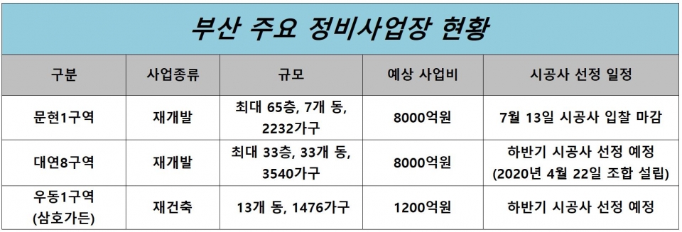 부산의 재개발·재건축 사업장은 170여 곳(재건축 64곳, 재개발 105곳)에 달한다. 그 중 해운대구 ‘우동 삼호가든 재건축’과 남구 ‘대연8구역’·‘문현1구역’ 재개발사업 등이 대표적인 대어로 꼽힌다. 공사비 규모가 8000억원에 달하는 사업지가 적지 않은 만큼 대형건설사들의 수주전이 치열할 전망이다.