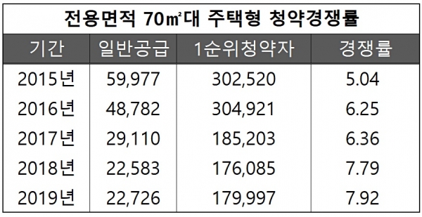 틈새면적의 청약 경쟁률도 점차 상승하고 있다. 한국감정원 청약홈에 따르면 전국에서 분양된 전용 70㎡대 주택형의 1순위 청약 경쟁률은 2015년 5.04대 1에서 해마다 올라 지난해에는 7.92대 1을 기록했다. 연도별로는 △2015년 5.04 대 1(5만9977가구 공급, 30만2520명 청약) △2016년 6.25대 1(4만8782가구·30만4921명 ) △2017년 6.36대 1(2만9110가구·18만5203명) △2018년 7.79대 1(2만2583가구·17만6085명) △2019년 7.92대 1(2만2726가구·17만9997명)이었다.