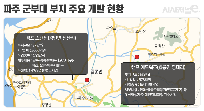 지난해 캠프 스탠턴과 함께 월롱면 영태리 ‘캠프 에드워즈’의 우선협상 대상자로 선정된 현대엔지니어링 컨소시엄도 조만간 파주시와 협약을 맺을 예정이다. 현대엔지니어링 컨소시엄은 63만㎡ 부지에 578억원을 들여 5900가구의 단독·공동주택용지 등의 도시개발 사업을 추진한다. 파주시는 문산읍에 위치한 ‘캠프 자이언트’(69만㎡)와 ‘캠프 개리오언’(48만㎡)도 올해 하반기에 공모를 진행해 사업자를 선정한다는 계획이다.
