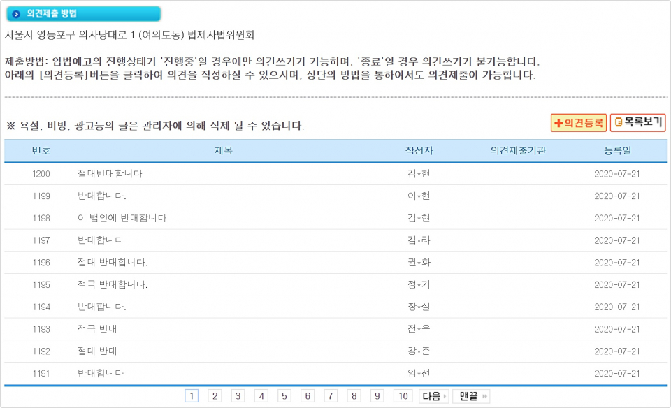 법인 발의 소식에 시민들 사이에선 반대 여론이 들끓고 있다. 실제로 ‘입법예고 등록의견’ 게시판에는 현재 1200건이 넘는 반대 의견이 등록된 상태다. 한 시민은 “가격을 올리지도 못하고 갱신 기간도 길다면 누가 임대인을 하겠나”며 “임차인만을 위하는 것처럼 보이나 결국엔 임대인을 없애 임차인을 궁지에 모는 법안이다”며 법안 철회를 촉구했다. 이어 “국가가 임대주택을 공급하면 되지 개인의 재산을 국유화하려는 것은 명백한 사유재산권 침해다”라고 덧붙였다.
