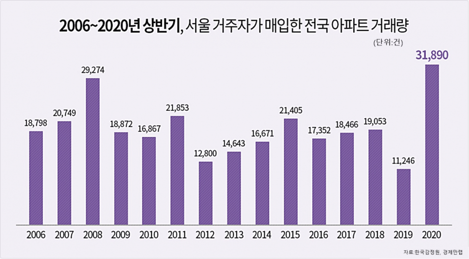 2일 한국감정원의 아파트 매매 거래현황에 따르면 올해 상반기 서울 거주자의 전국 아파트 매입 거래량은 3만1890건으로 집계됐다. 이는 한국감정원이 관련 통계를 작성하기 시작한 2006년 이후 최고치다.